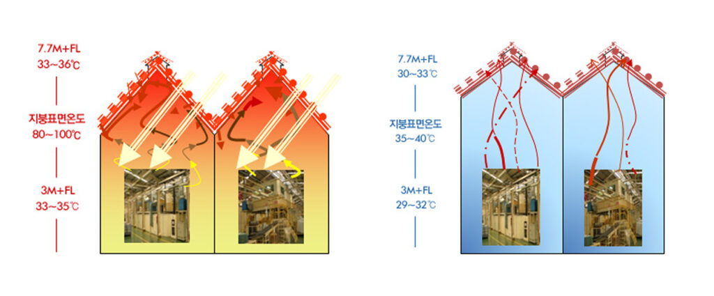• 실내온도 보다 높은 지붕 온도가 실내 열공기 방출을 방해함