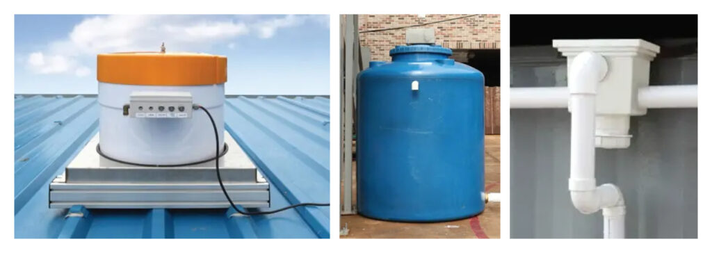 냉방–제설–미세먼지 저감 기능을 제공하는 시스템 복합 설비. 스마트 스프링클 – 금비, 자동집수장치 – 하마, 증발 방지 물탱크 – 하마