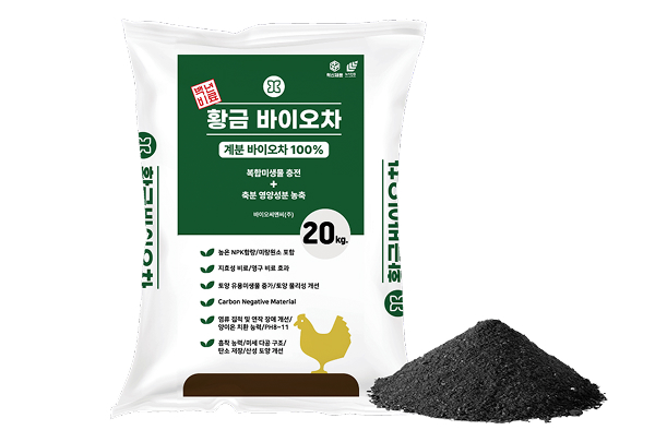 • 우분, 계분, 돈분 혼합 바이오차 • 토양 유용미생물 증가, 토양 물리성 개선 • 염류 직접 및 연작 장애 개선, 양이온 치환 능력, pH 9~10 • 완효성 비료 효과, 반영구적 퇴비 | |